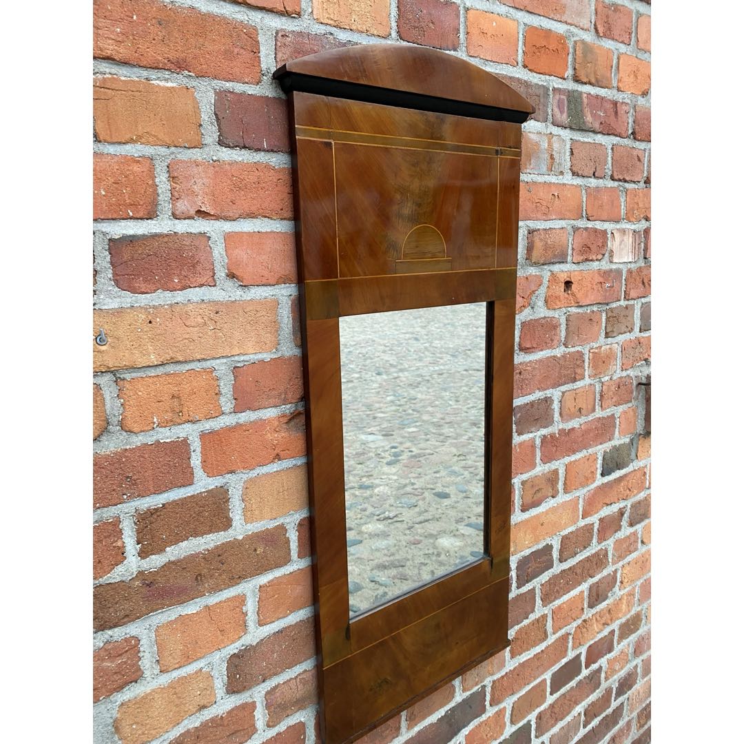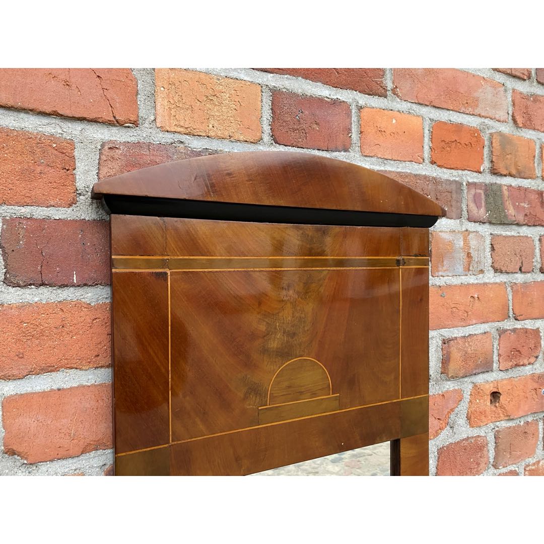 Zabytkowe lustro w stylu Biedermeier prawdopodobnie z I poł XIX w. Okleina prawdopodobnie mahoń płomienisty. Dobry stan. Ślady użytkowania. Polecam