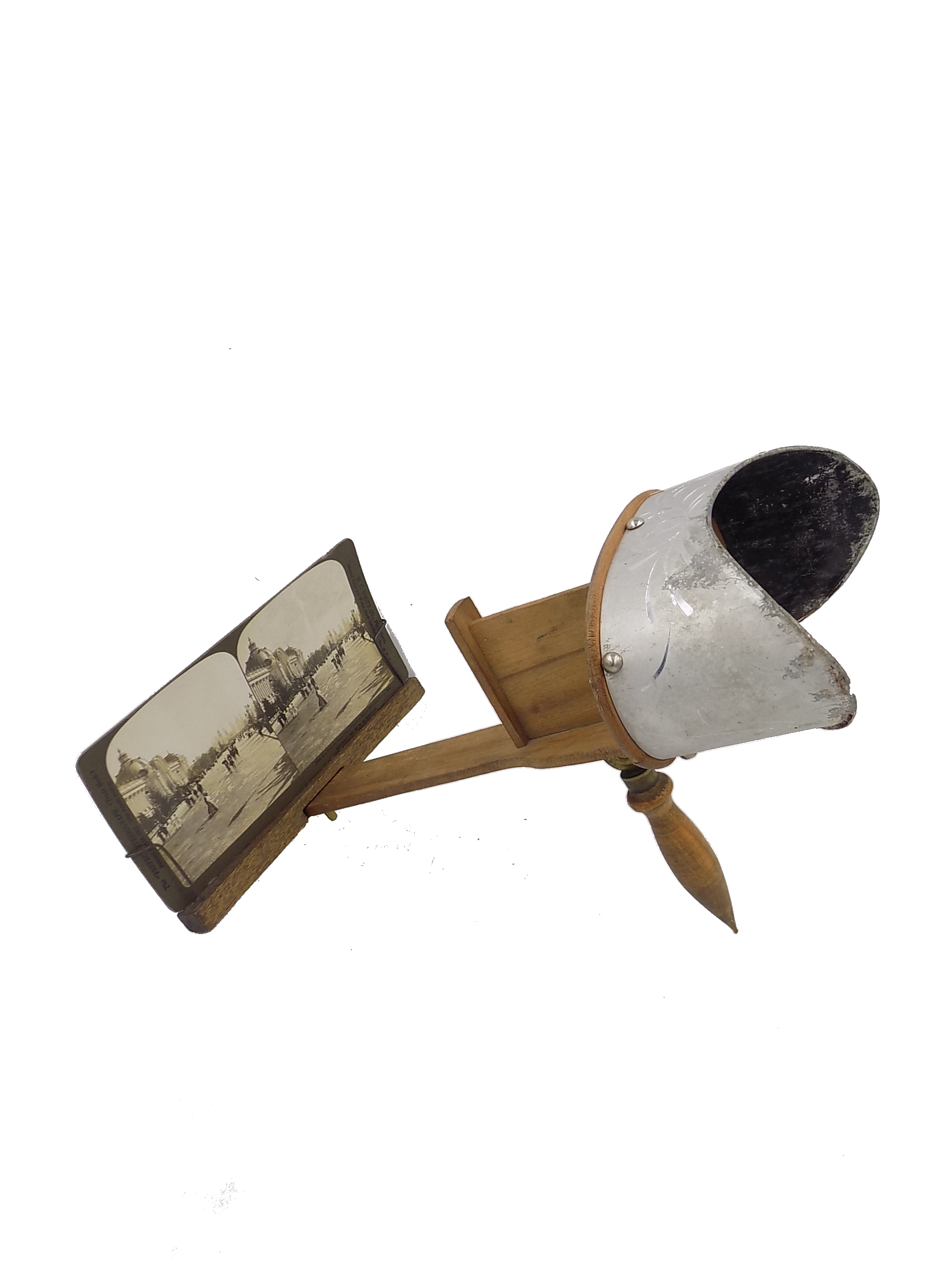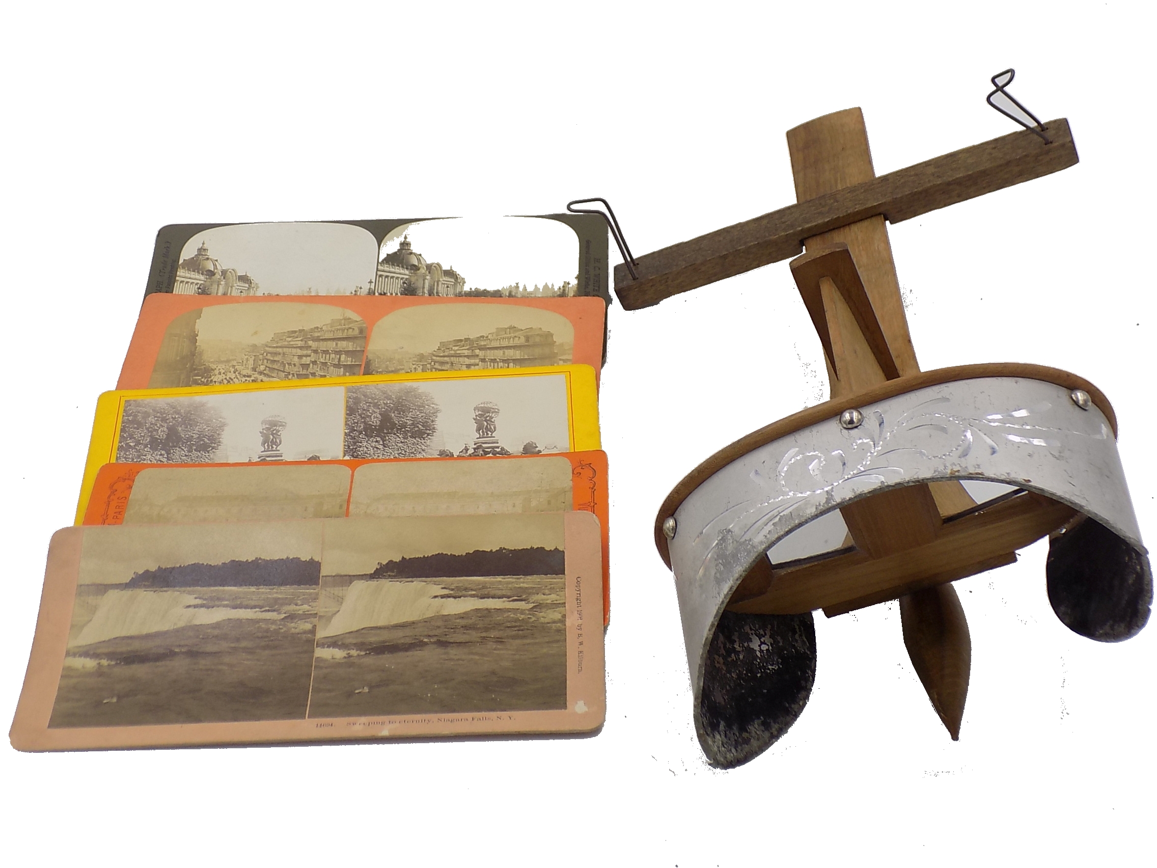 Zabytkowy stereoskop + 5 zdjęć stereoskopowych z końca XIX wieku. Stereoskop jest to przyrząd optyczny, służący do obserwowania fotografii stereoskopowych. Fotografia stereoskopowa składa się z dwóch zdjęć tego samego obiektu, ale wykonanych z różnych punktów widzenia. Patrzący przez stereoskop widz ma wrażenie przestrzenności i trójwymiarowości oglądanej sceny. (źródło; Wikipedia). Wymiary; wys.13,5 x 33 x 6 cm.