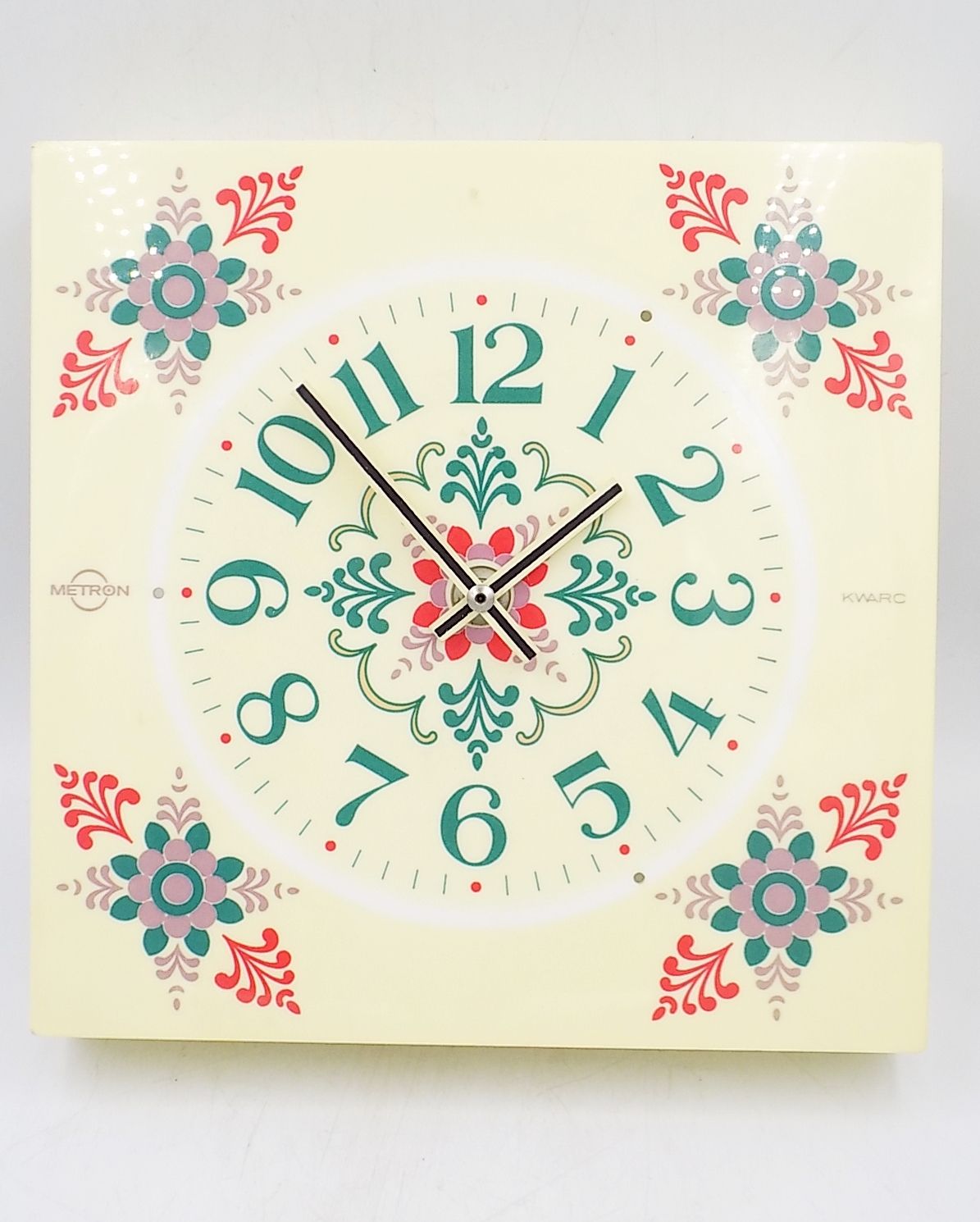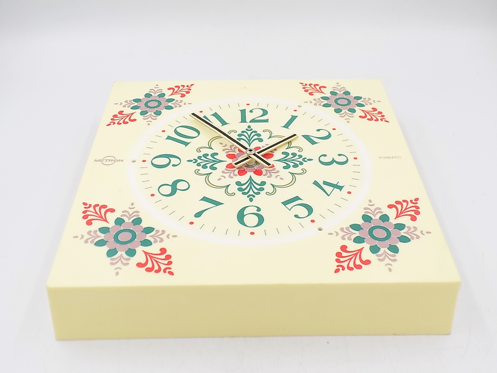 Zegar wiszący z Fabryki Wodomierzy i Zegarów Metron w Toruniu z 1982 r. Sprawny. Wymiary; 4,5 x 23,5 x 23,5 cm