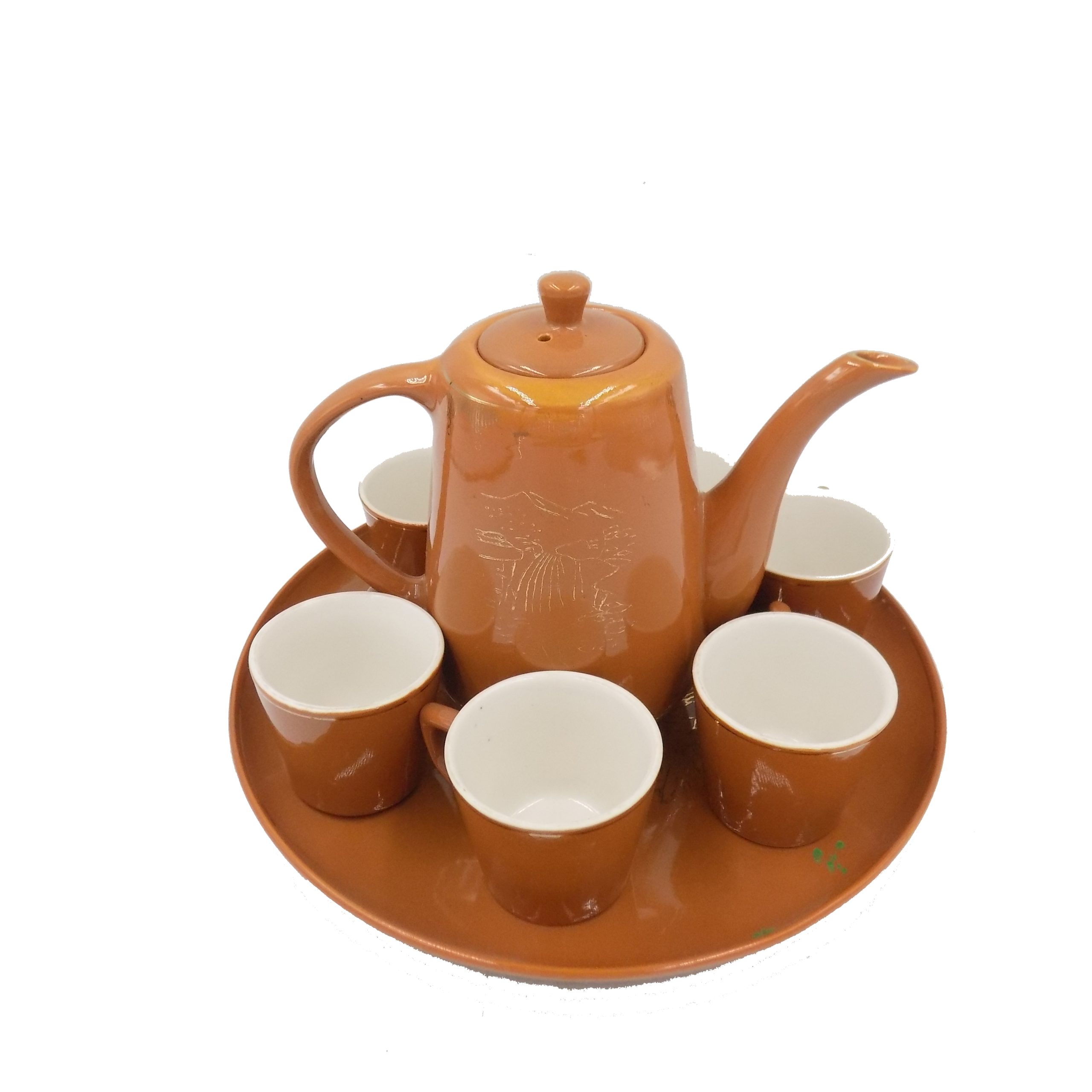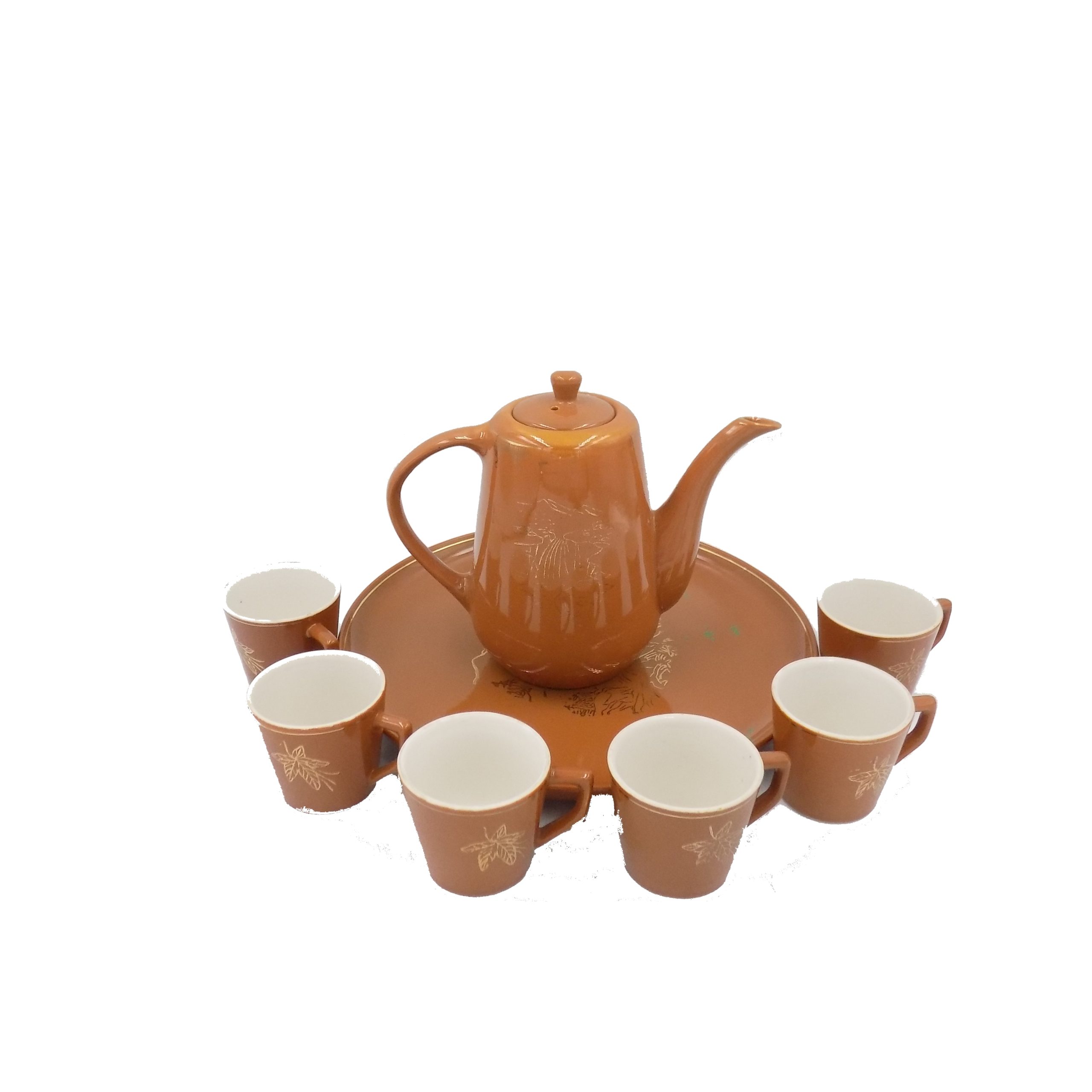 Zestaw do kawy z okresu PRL. Sygnowany. Wymiary; dzbanek 14,5 cm, taca 23,5 cm, mokki wys.5 x 5,5 cm