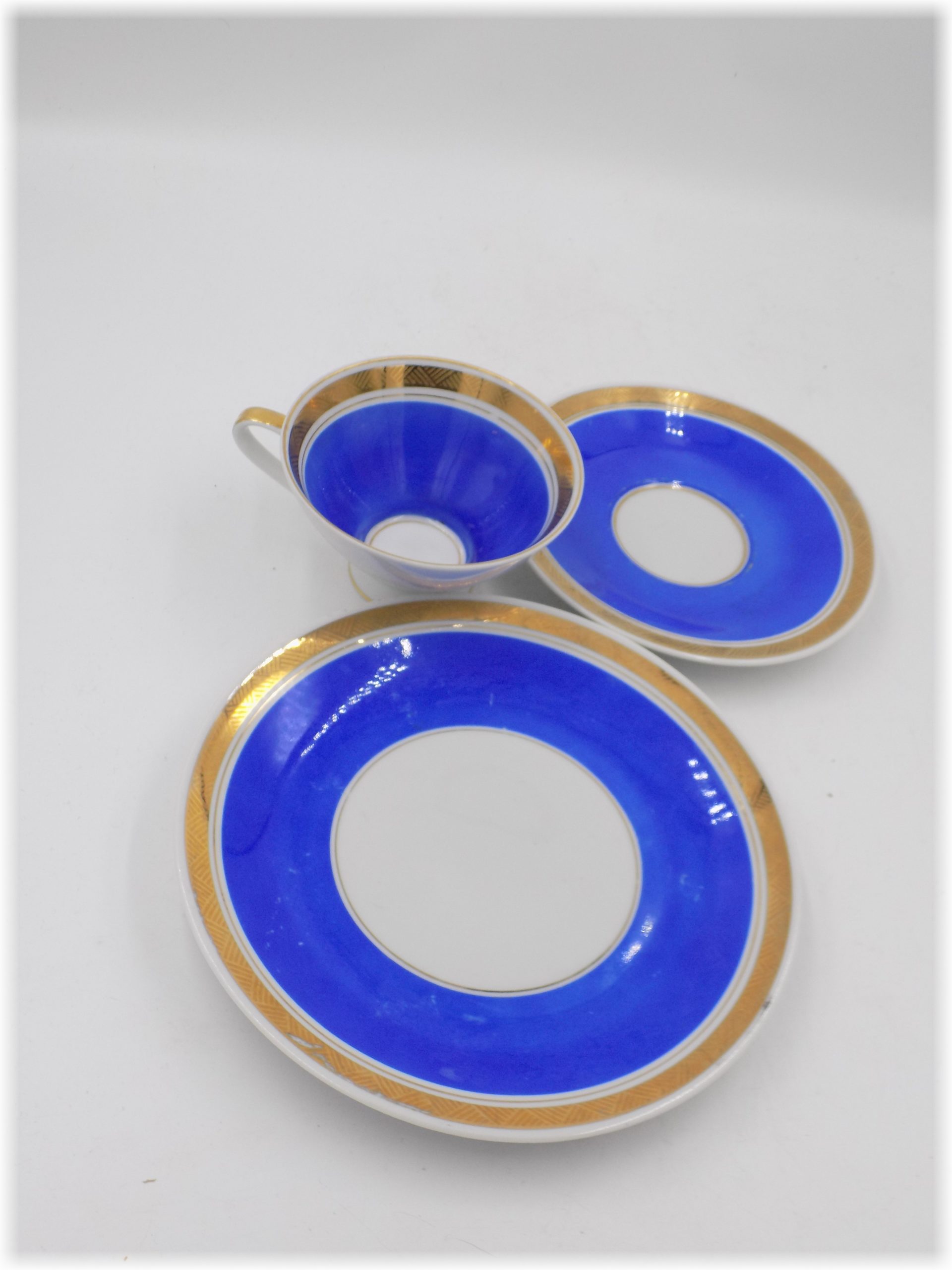 Zestaw śniadaniowy z lat 60/70-tych. Sygnowany. Wymiary; wys.6 x 10,5 cm, talerzyki 19 i 15 cm. Ślady użytkowania.