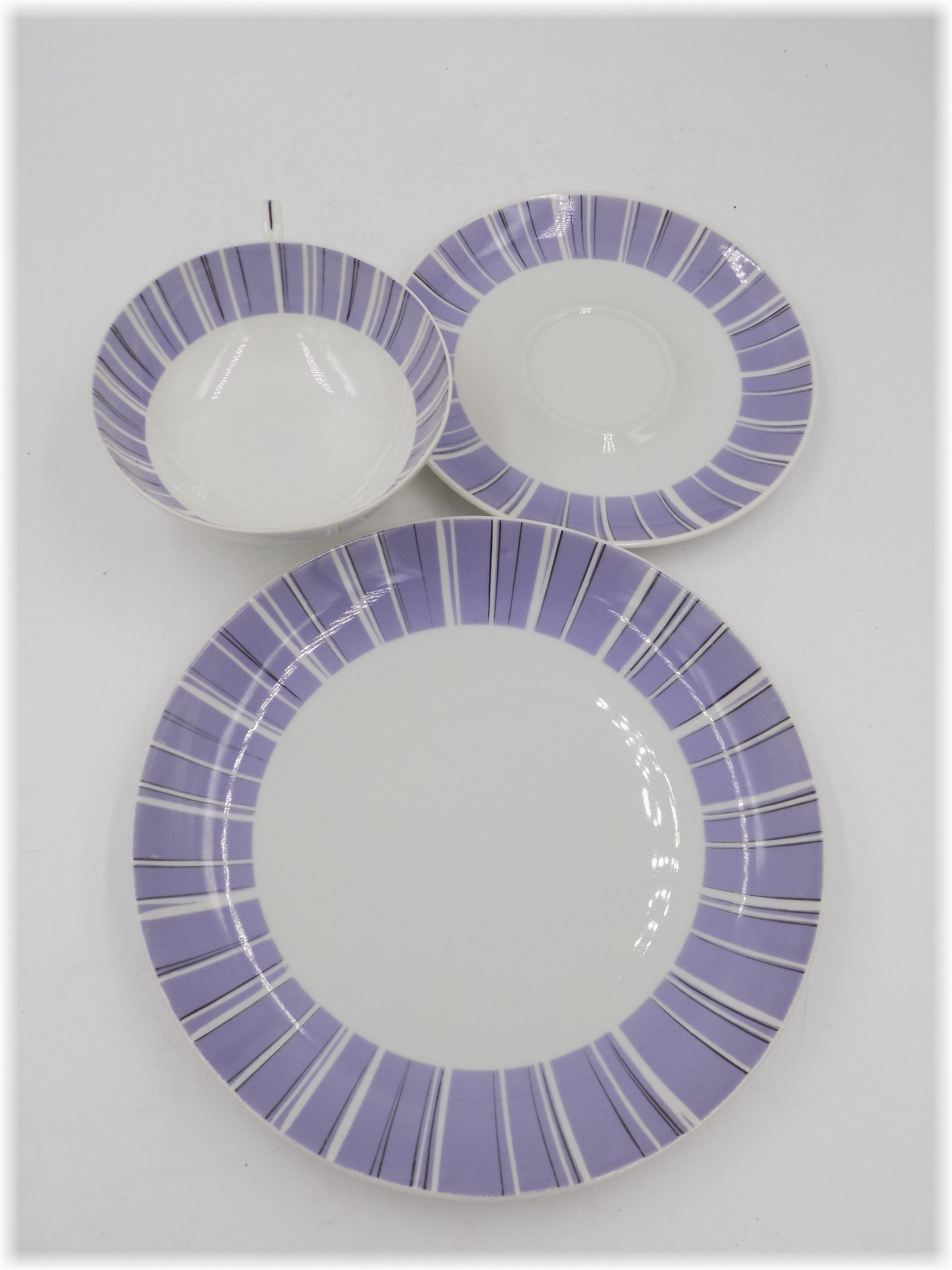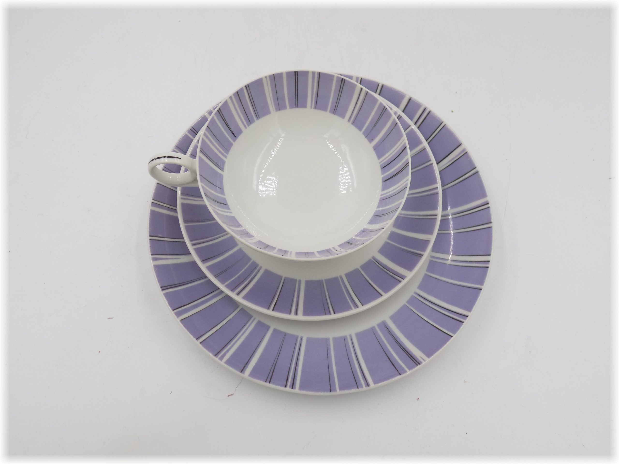 Porcelanowy zestaw śniadaniowy z cenionej wytwórni w Wallendorf. Ręcznie zdobiona. Sygnatura stosowana od 1964 roku. Wymiary; wys.5,5 x 11 cm, talerzyki 20 i 15,5 cm