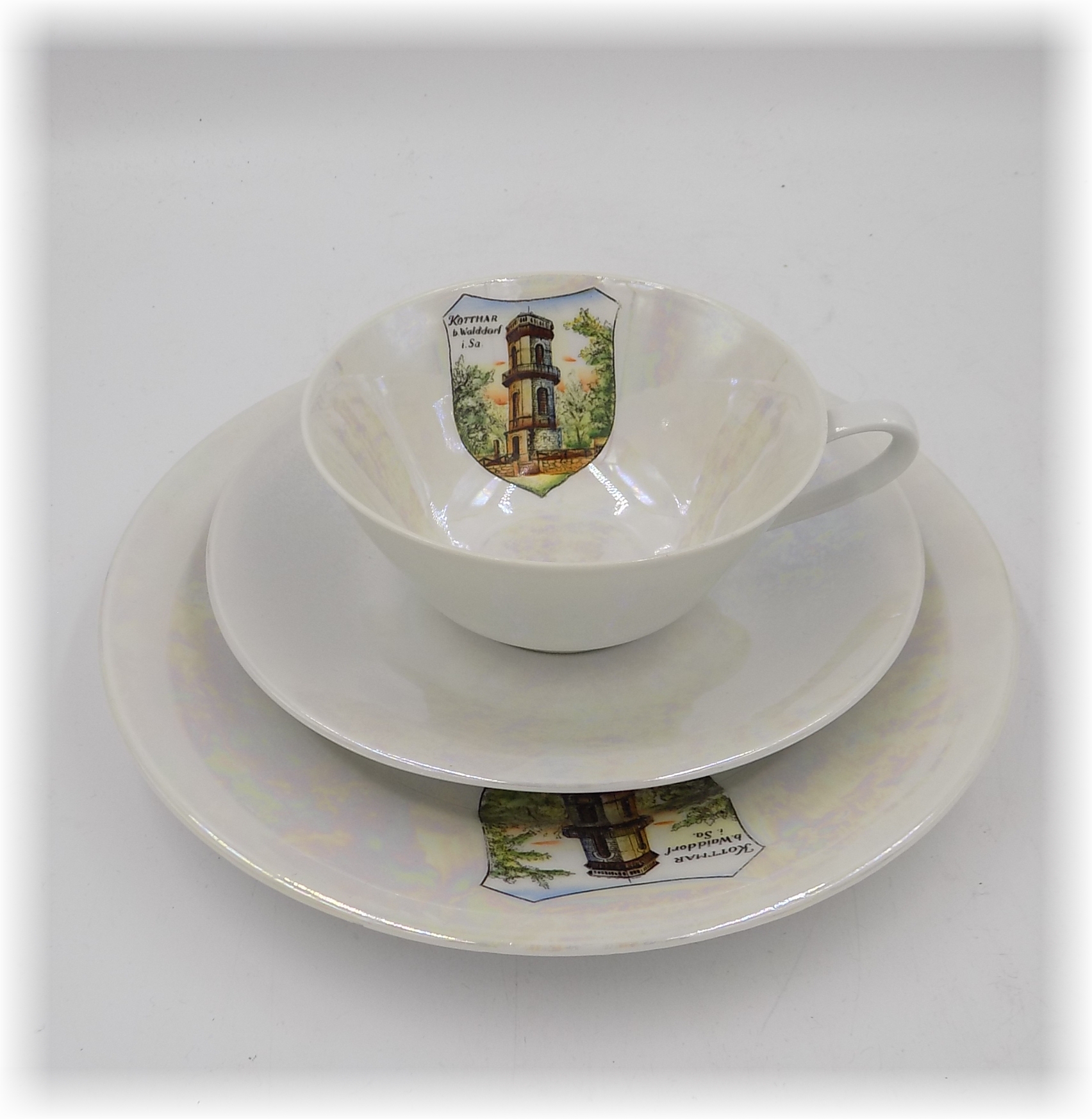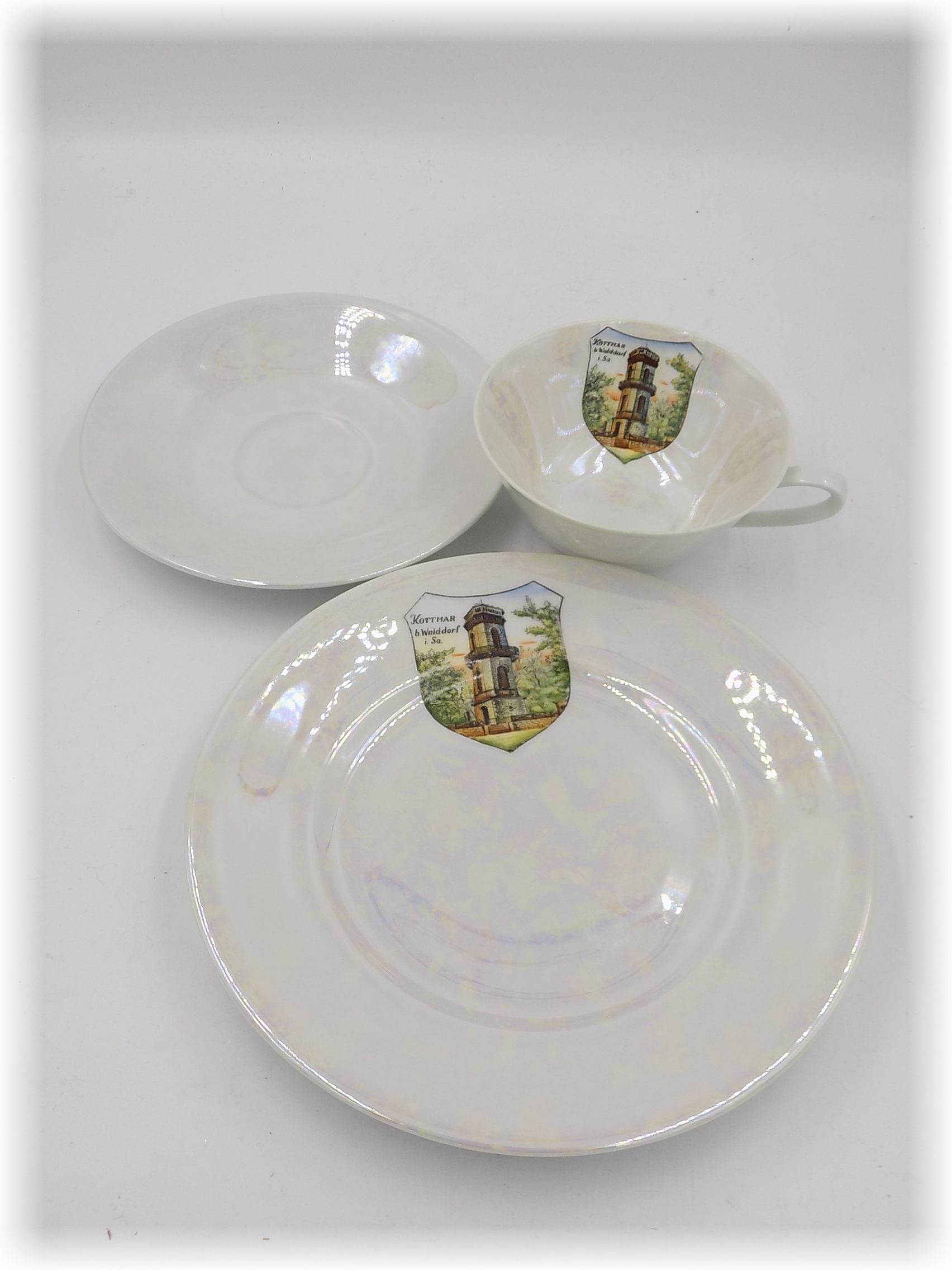 Reklamowy zestaw śniadaniowy z wytwórni porcelany w Weimar Germany. Sygnatura stosowana w latach 1933-45. Wymiary; wys.5 x 10,5 cm, talerzyki 15 i 19,5 cm.